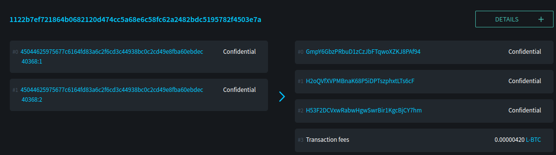This is interesting: So although the transaction is visible, we can't see what was actually transferred (even though the details of the asset are visible, it is still hidden inside the transaction). Further, where is my Green Wallet address (ie. VJLJZQ...)? We can see 3 output addresses, presumably these are: Change, Fee, and Recipient...but which is my Green Wallet?