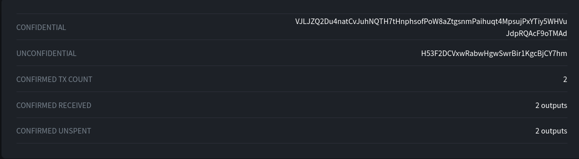 So now this shows us that the Confidential Address: VJLJZQ2... corresponds to the Unconfidential Address: H53F2D.... Through the magic of one-way hashes, if we know the "Confidential" address we can then dervive its public address....however just by looking at the public blockchain, there is no way to reverse that hash.