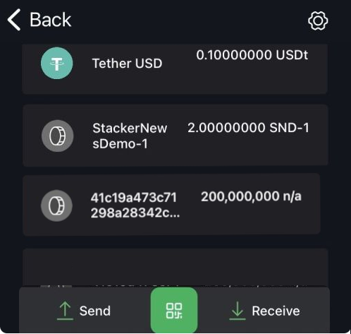 • Let's try sending 2 of these unblinded assets to another wallet (my Blockstream Green mobile wallet) and see what is visible on the network.